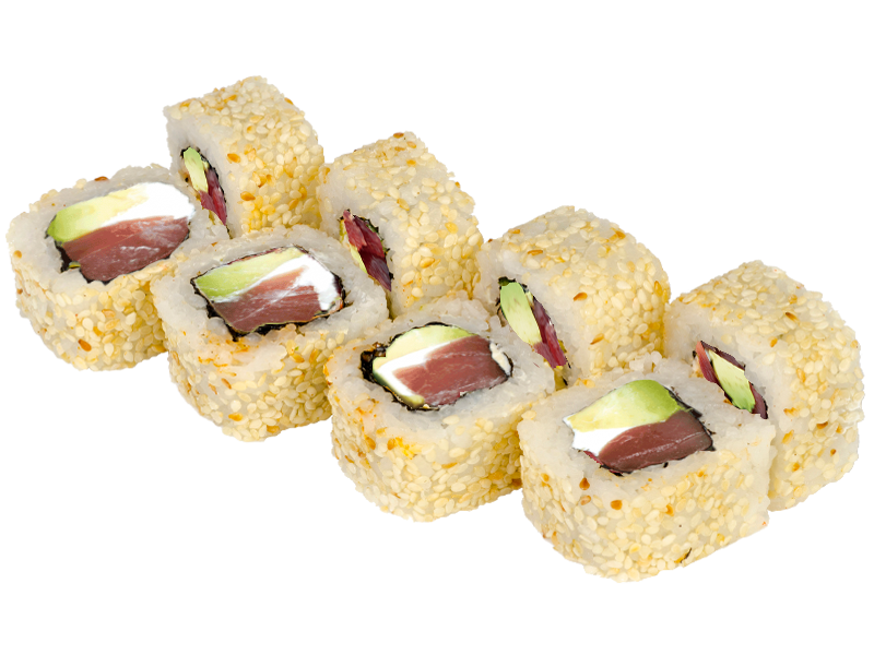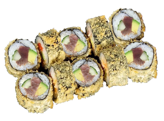 Ebi-Tempura, Mango, Avocado, flambierter Thunfisch on Top und Teriyaki Sauce(1,4,a,b,d)