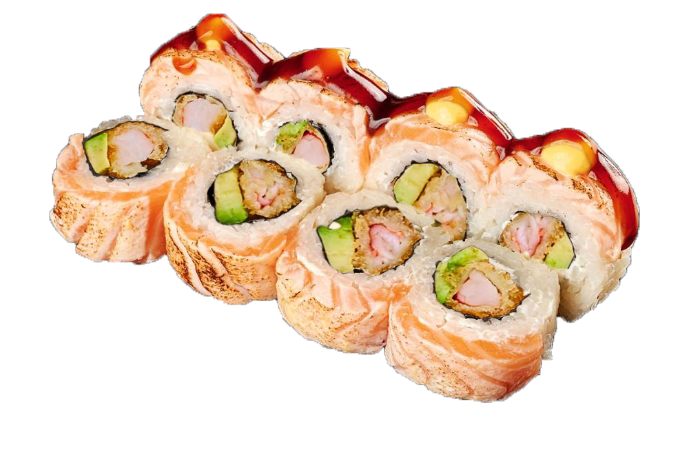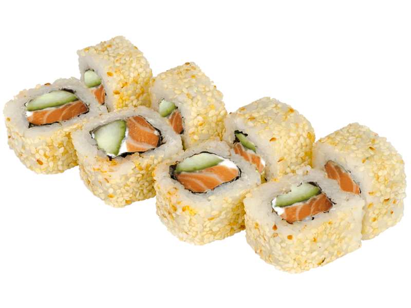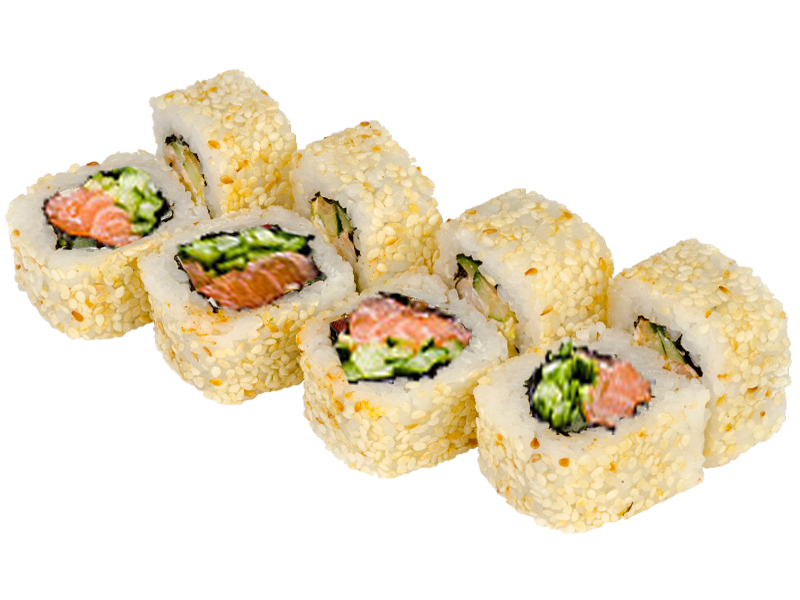 Knusprig panierte Rolle mit Lachs, Avocado, Frischkäse, Sesam, Chili-Mayo und Teriyaki Sauce(1,4,a,d,g,l)